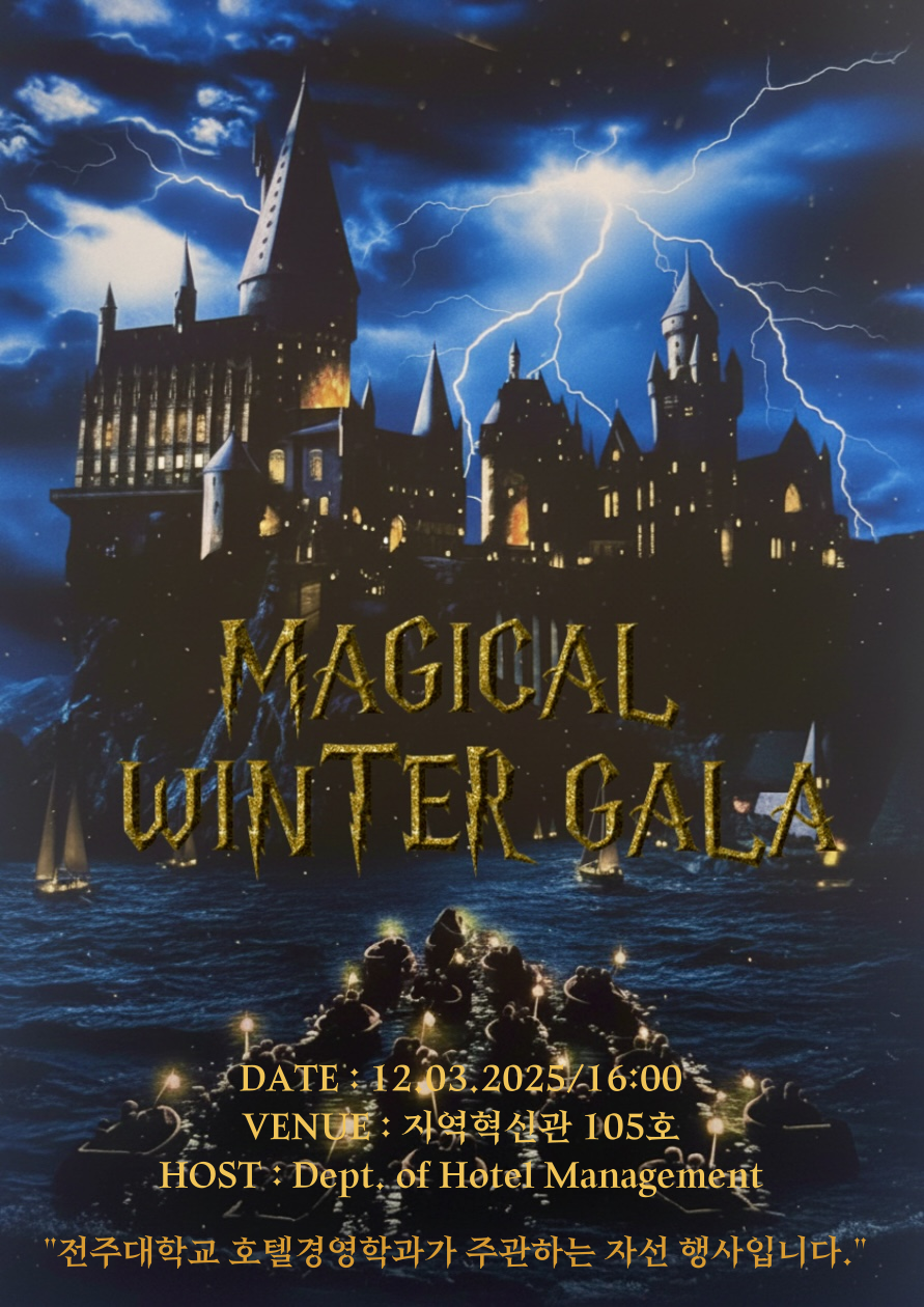 ❄️✨ MAGICAL WINTER GALA ✨❄️ "MAGICAL WINTER GALA"는 전주대학교 호텔경영학과 연회 및 이벤트 수업 수강생들이 직접 기획·운영하며, 따뜻한 연말을 함께 나누기 위해 마련된 자선기부 행사입니다. 이번 행사에서 발생하는 모든 수입금은 기부될 예정이며, 여러분의 참여가 누군가에게 소중한 온기가 됩니다. 호그와트의 하루가 펼쳐지는 마법같은 축제가 열립니다. 다양한 게임과 먹거리, 특별한 이벤트까지 준비했으니 마법의 세계를 즐기러 꼭 와주세요! 여러분의 많은 참여와 관심을 기다립니다✨ 따뜻한 마음이 모여 만드는 특별한 순간, 함께해 주세요! |